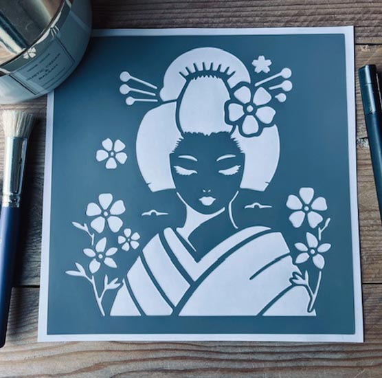 Pochoir Adhésif 22 x 20 cm Silhouette Femme Asiatique & Fleurs cerisier