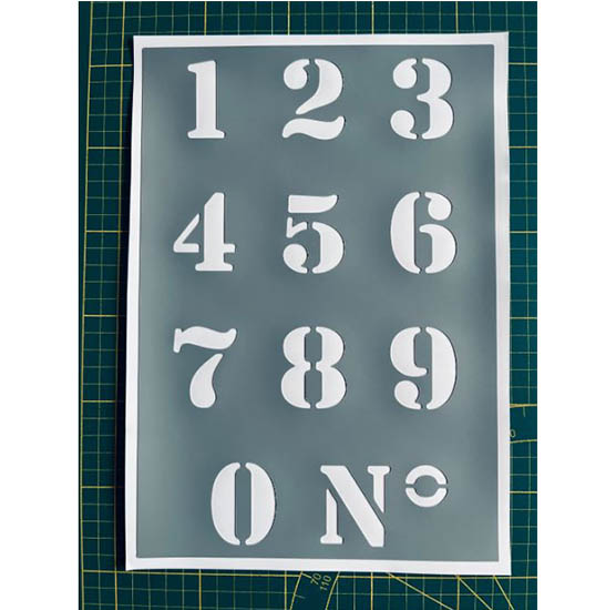 30 x 18 cm pour le pochoir en entier, 5 cm par chiffre environ.