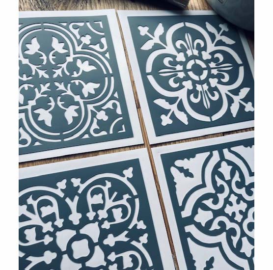 FABRICATION: Produit artisanal français, vendu en lot de 4 pochoirs pour motifs de carrelage et faïence. |